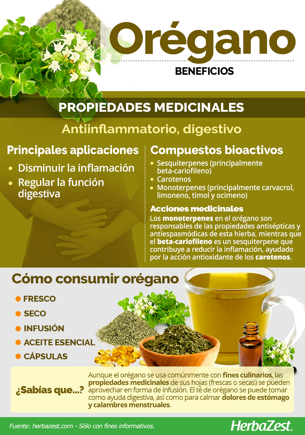 Infusión. Frescas o secas, las hojas de orégano se pueden remojar en agua caliente para obtener una infusión tibia. El té de orégano se puede tomar para facilitar la digestión, así como para calmar el dolor de estómago y los cólicos menstruales.