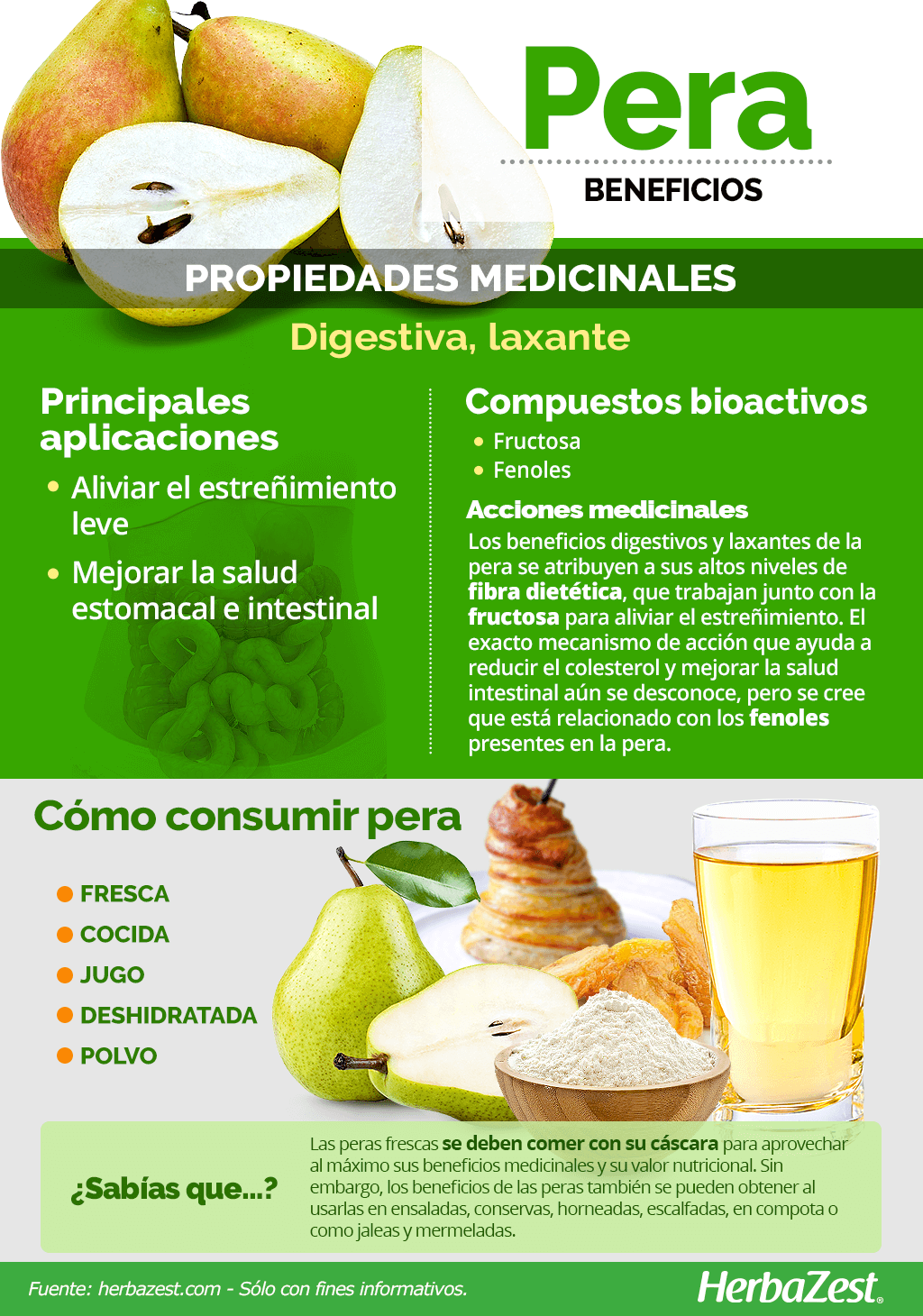 Jugo. Debido a su contenido de fructosa, el jugo de pera también puede aliviar el estreñimiento y ayudar a mejorar la salud digestiva. Este efecto puede verse potenciado si se incluye la fibra dietética de la fruta.