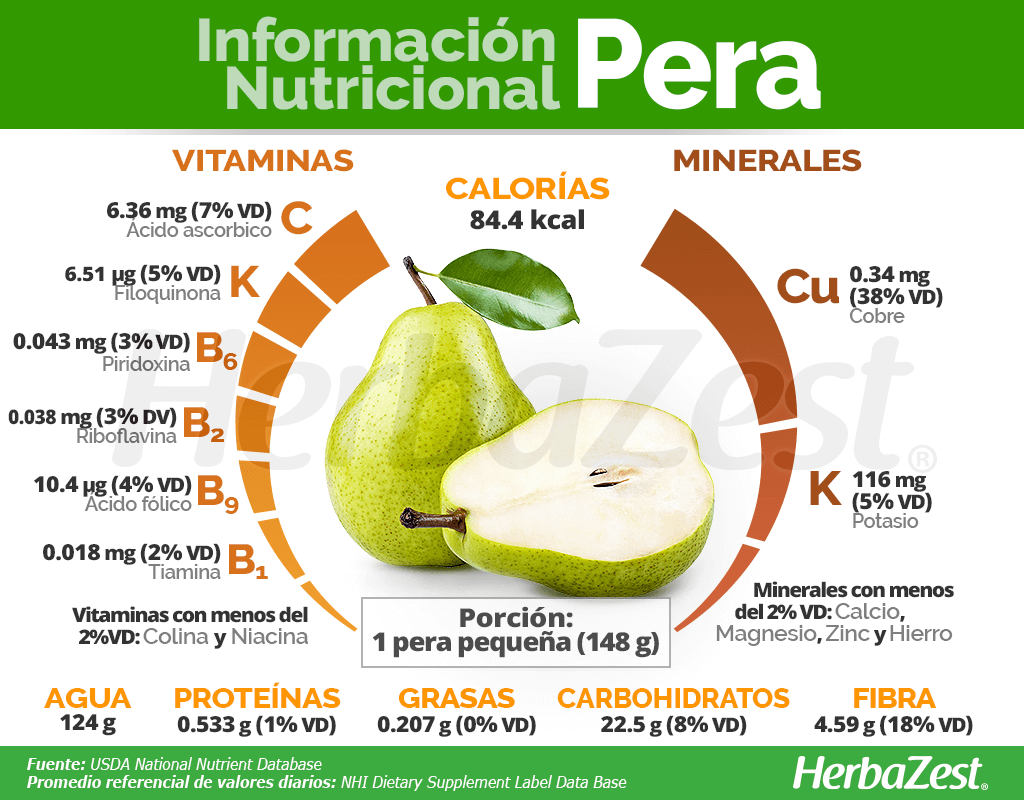 UNA PERA PEQUEÑA (148 G) PROPORCIONA 84 CALORÍAS, ASÍ COMO 8 Y 18% DEL VALOR DIARIO RECOMENDADO DE CARBOHIDRATOS Y FIBRA DIETÉTICA.