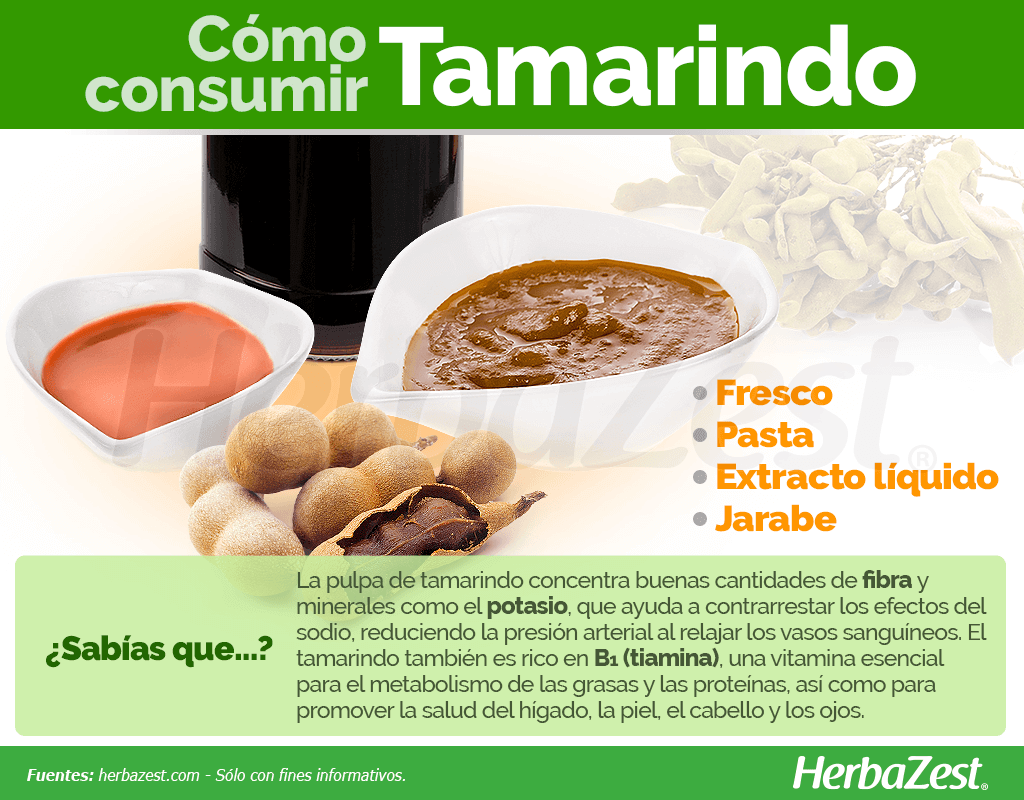 El tamarindo proporciona una gran cantidad de nutrientes; sin embargo, debe consumirse en pequeñas cantidades debido a sus propiedades laxantes. La pulpa de tamarindo es una buena fuente de fibra dietética y minerales esenciales, tales como el potasio, que ayuda a contrarrestar los efectos del sodio, reduciendo la presión arterial al relajar los vasos sanguíneos; y el hierro, necesario para la producción de glóbulos rojos y la prevención de anemia.