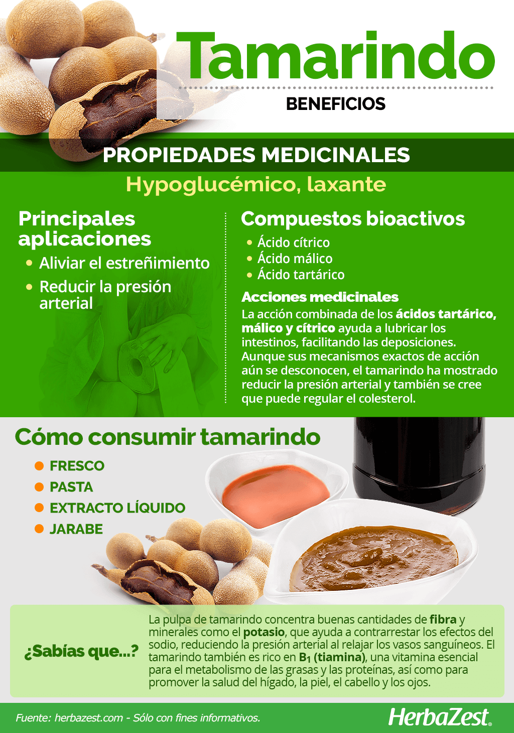 Extracto líquido. El extracto de tamarindo funciona como un laxante suave debido a su alta concentración de ácidos tartárico, málico y cítrico.