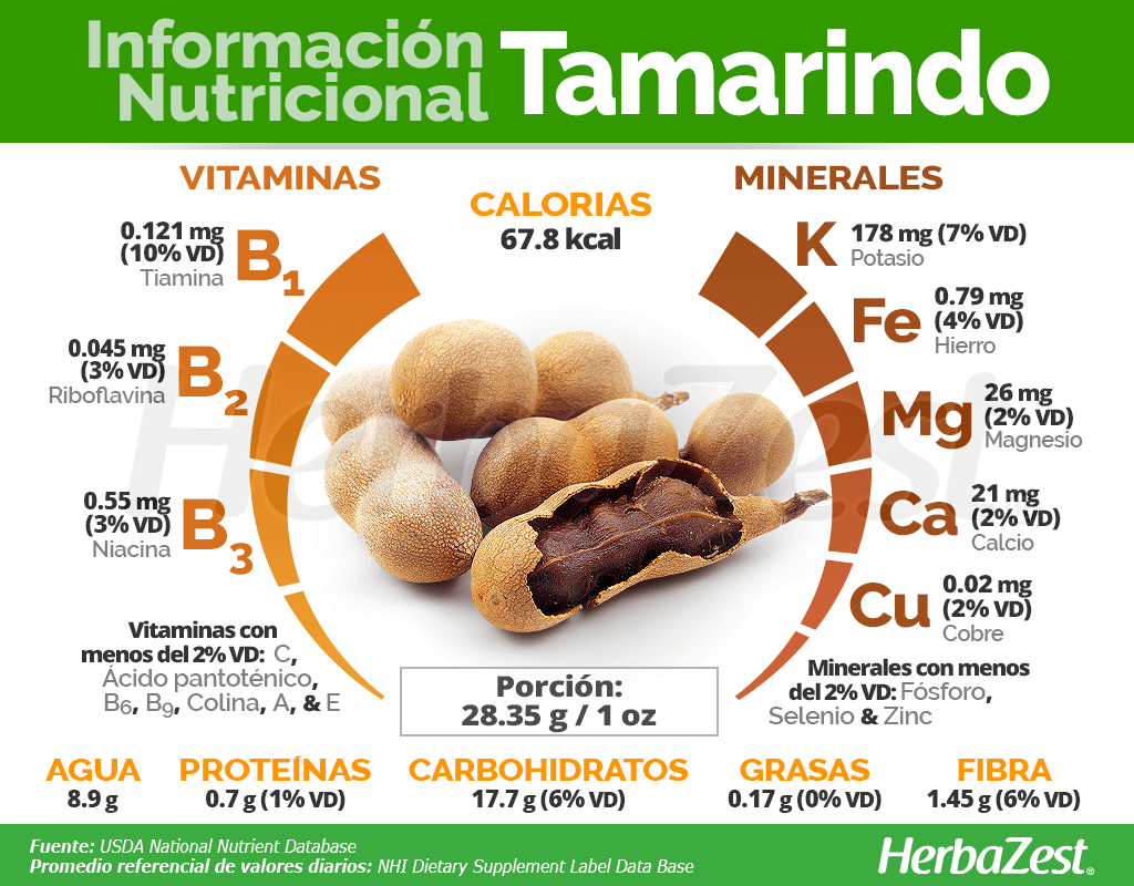 UNA ONZA DE PULPA DE TAMARINDO FRESCO (28.35 G) PROPORCIONA APROXIMADAMENTE 68 CALORÍAS, ASÍ COMO EL 6% DEL VALOR DIARIO RECOMENDADOPARA CARBOHIDRATOS Y FIBRA DIETÉTICA.