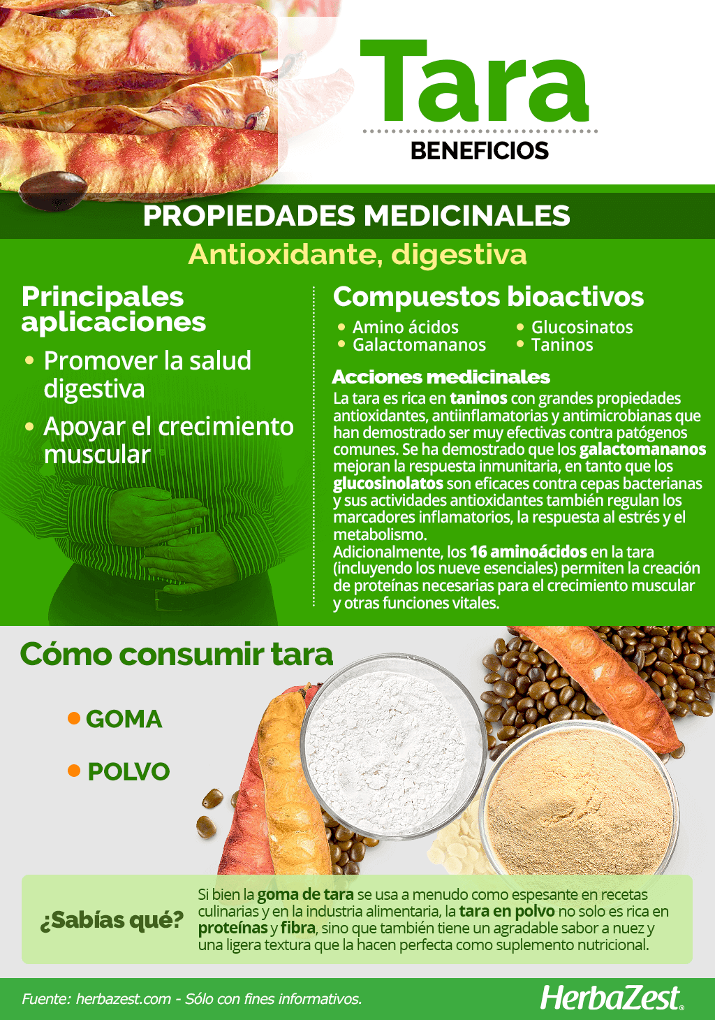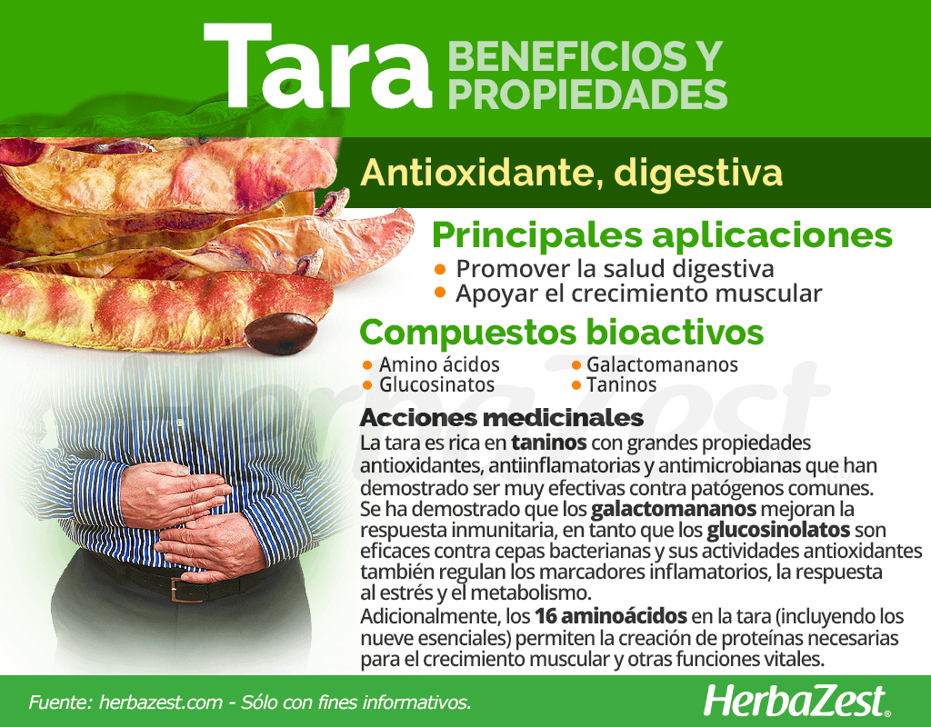 Promover el crecimiento muscular. Las semillas y vainas de tara son una buena fuente de proteína vegetal, lo que las convierte en una buena opción para desarrollar y mantener una masa muscular saludable.