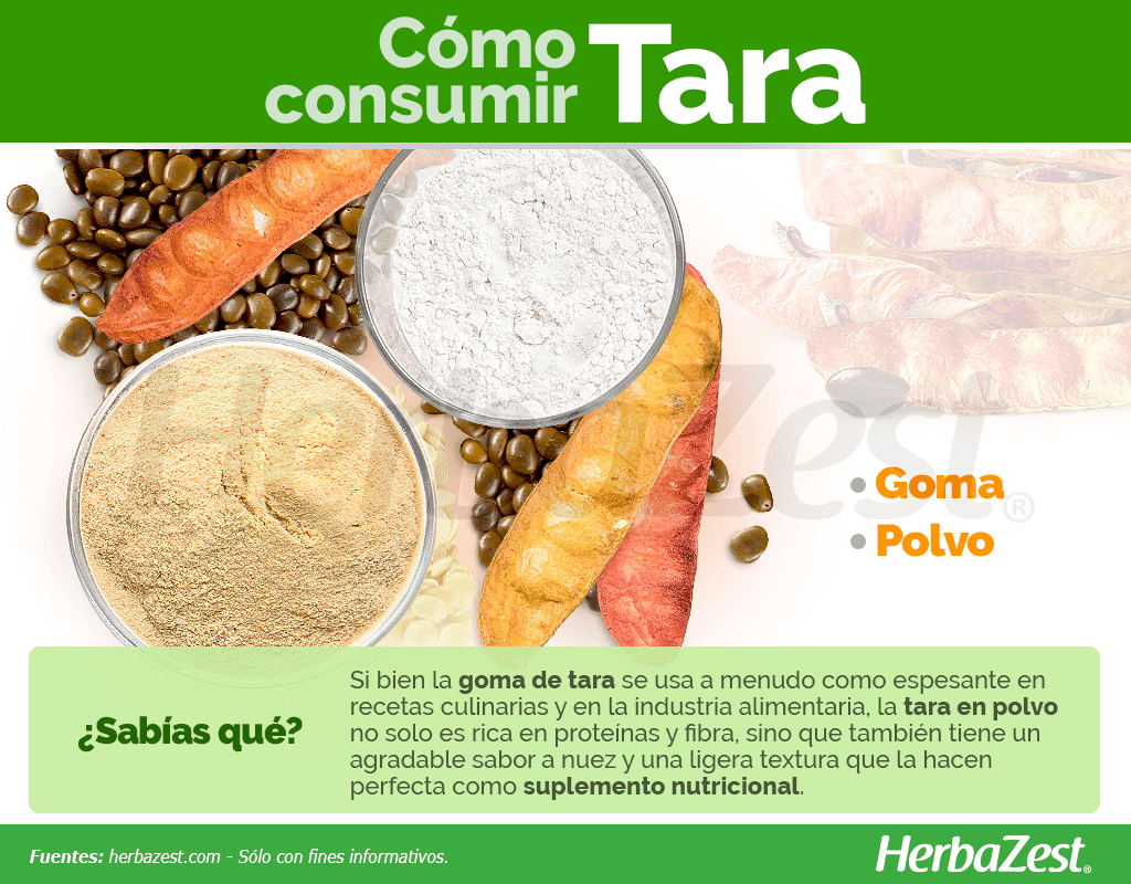 Goma. La goma de tara se obtiene del interior de las semillas (endosperma), y se utiliza a menudo como espesante en recetas culinarias, como repostería y postres; es reducida en nutrientes pero aporta algunos compuestos antioxidantes.