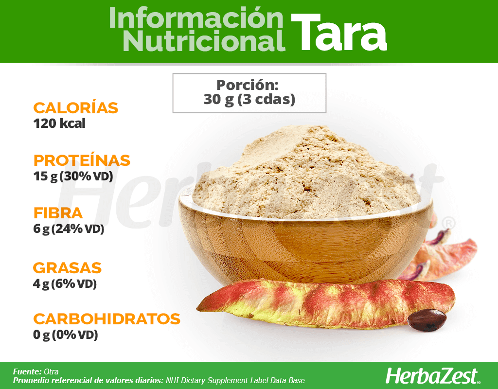 30 GRAMOS DE TARA EN POLVO PROPORCIONAN 120 CALORÍAS, QUE ESTÁN COMPUESTAS PRINCIPALMENTE POR FIBRA DIETÉTICA (21% VD) Y PROTEÍNAS (30% VD).