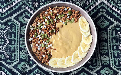Tazón de batido de fresa, mango y plátano con quinua en hojuelas - Batidos y jugos