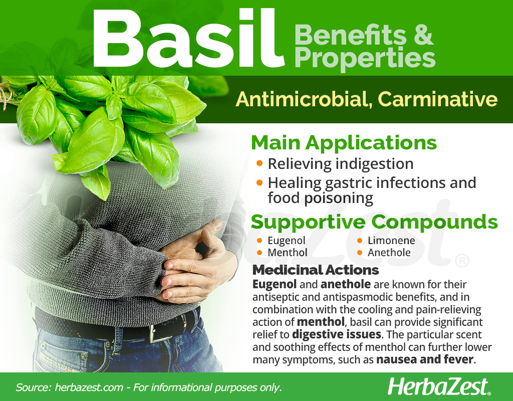 Healing gastric infections and food poisoning. Basil has numerous antimicrobial properties, which help relieve digestive issues, such as gastroenteritis.