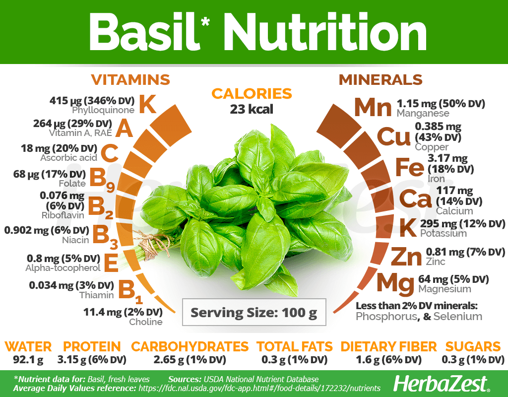 100 grams of basil fresh leaves provide 6%DV of protein, 1%DV of carbohydrates, 1.6%DV of fiber, and 23 calories.