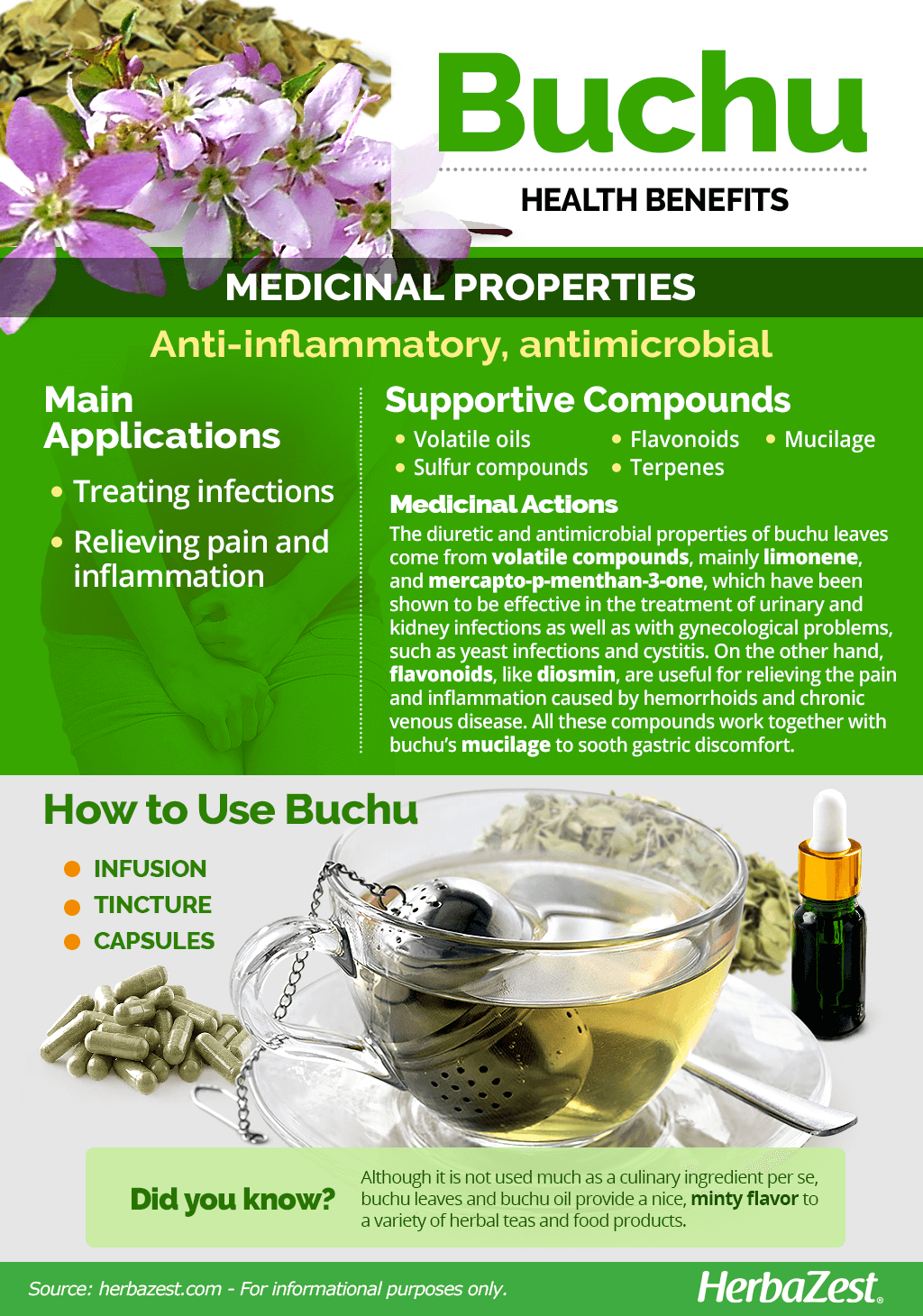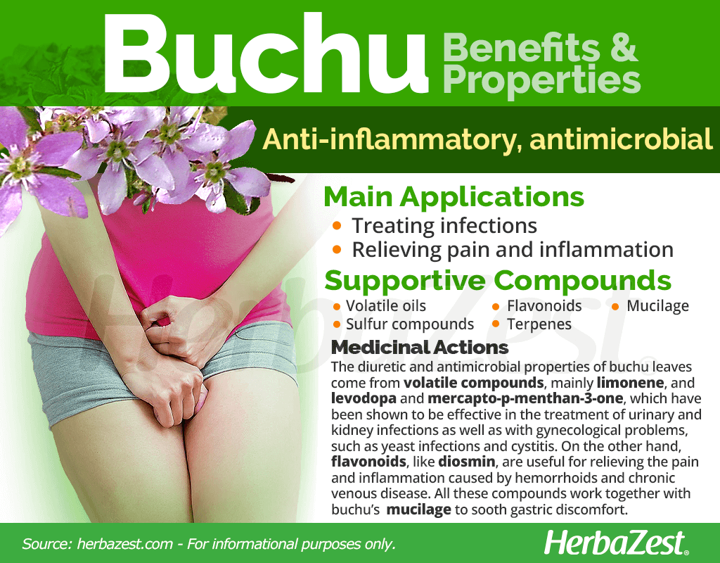 Treating infections. The antiseptic and antimicrobial properties of buchu are useful for treating kidney and urinary tract infections, as well as gynecological problems related to yeast infections.