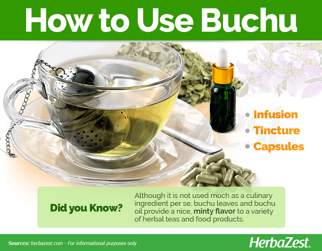 Capsules. This form of consumption is convenient for specific treatments since buchu capsules contain high amounts of active compounds, available in daily fixed doses, and help treat pain, inflammation, and urinary tract infections.