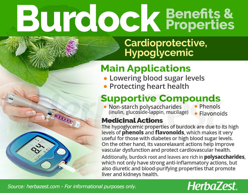 Burdock owes its hypoglycemic properties on its high phenolic and flavonoid content.1 On the other hand, it has been shown to ameliorate vascular dysfunction by allowing relaxation and suppressing inflammation.2