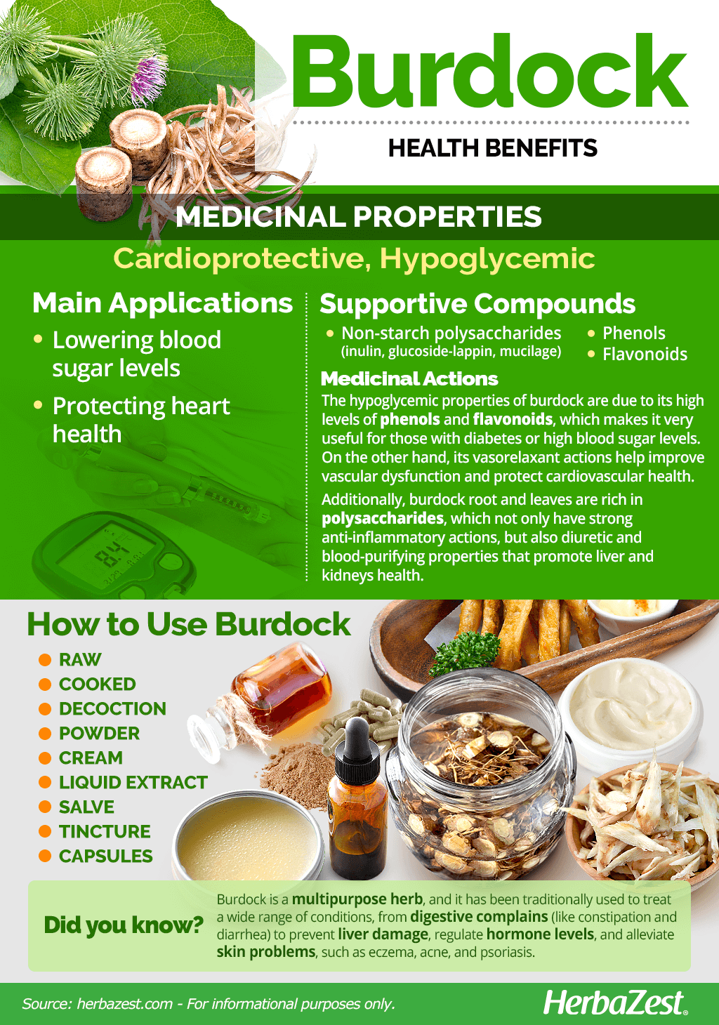 Capsules. In its most readily available medicinal form, burdock capsules have numerous benefits, including lowering blood sugar levels thanks to its hypoglycemic compounds, as well as protecting heart health.