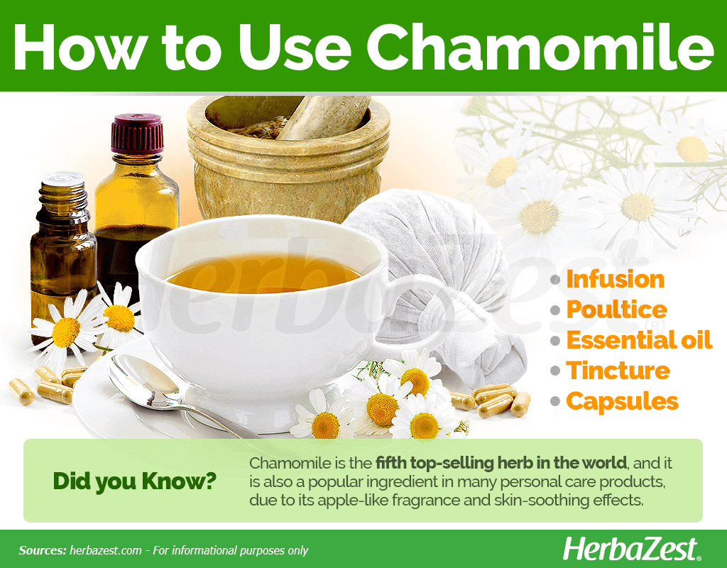 Infusions. One of its most popular medicinal forms, dried chamomile flowers can be brewed into a hot tea. Chamomile infusions primarily relieves upset stomach and bloating.