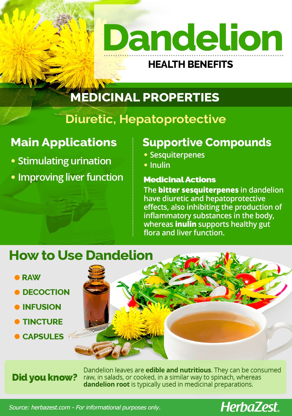 While the mechanisms behind the medicinal properties of dandelion (mainly diuretic and hepatoprotective) are yet to be explained, the herb boasts phytochemical compounds that may be responsible for many of its therapeutic actions.