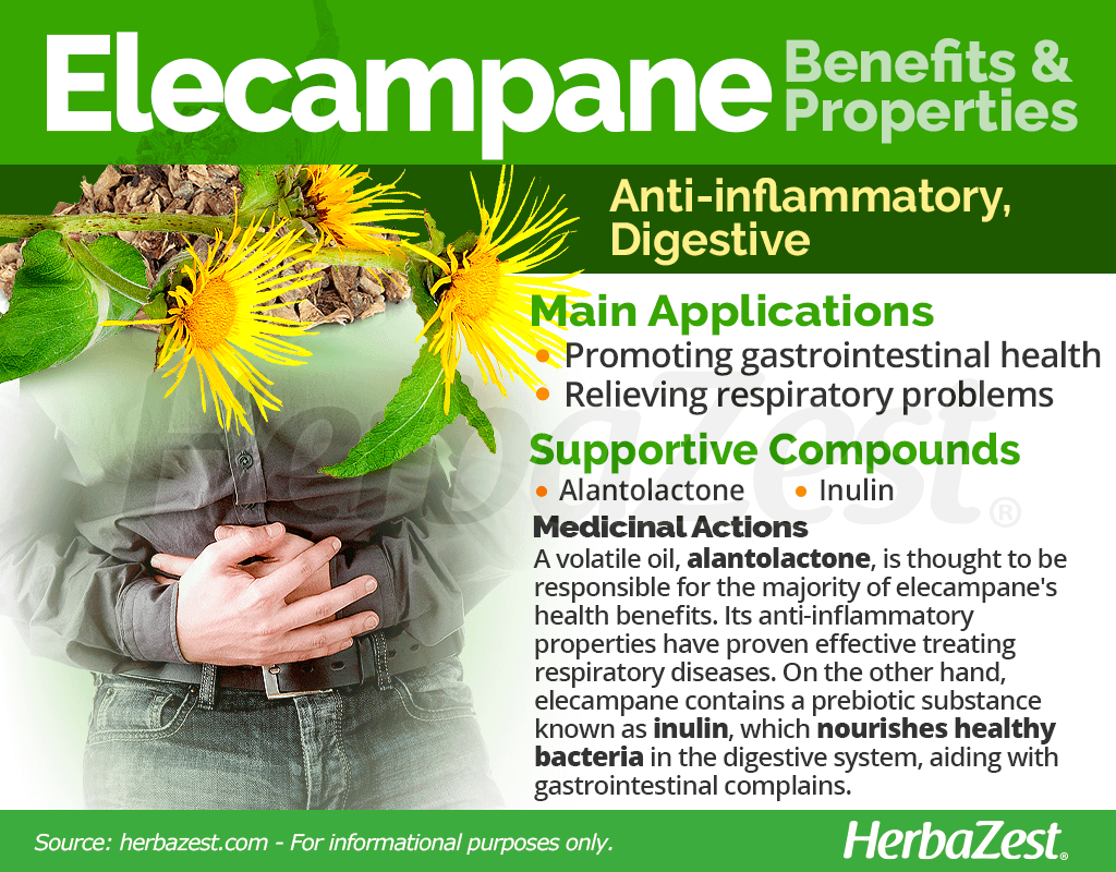 The roots and rhizome of elecampane possess the highest content of active compounds. They contain volatile oils, mainly alantolactone, which is thought to be responsible for the majority of elecampane's health benefits, as it has anti-inflammatory, antibacterial, anthelmintic, and analgesic properties, however its mechanism of action is yet to be fully understood.1