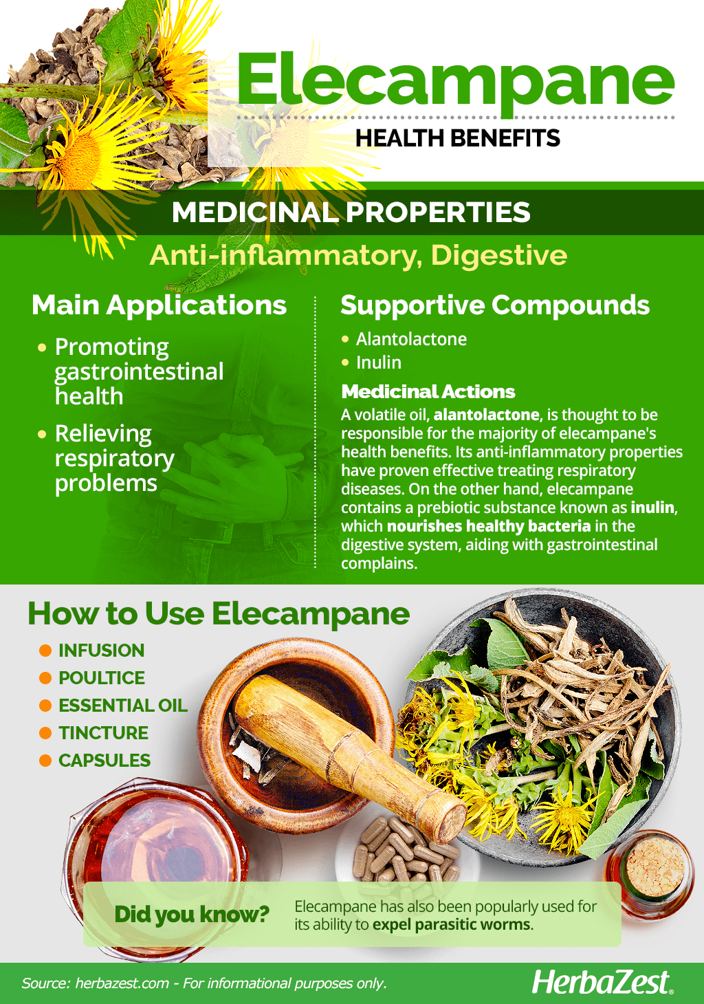 Additionally, elecampane has also been popularly used for its ability to expel parasitic worms.