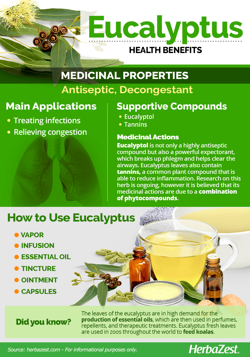 The most effective way of obtaining the health benefits from eucalyptus is in medicinal forms of consumption.
