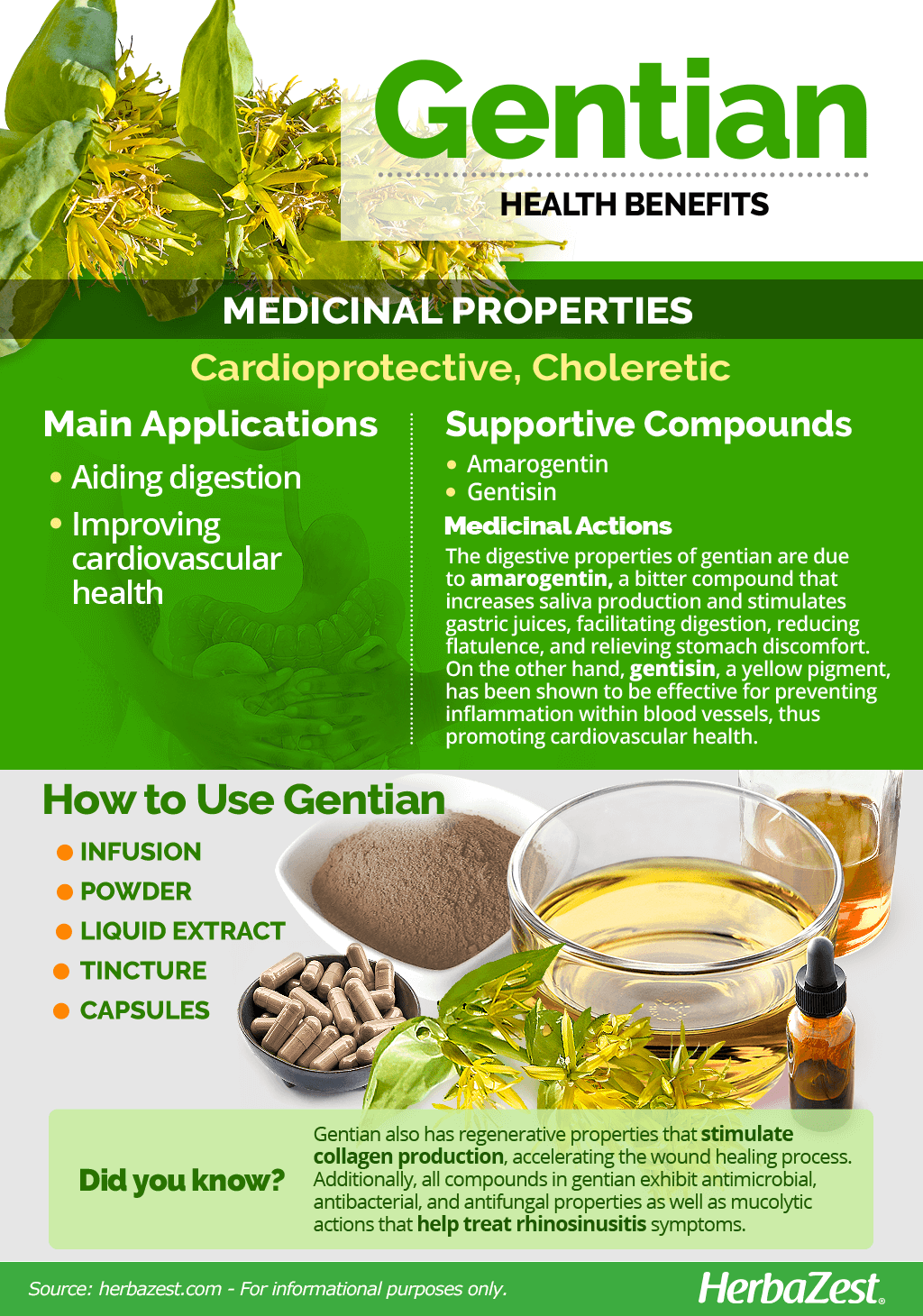 Liquid extract. In this distillated form, gentian can improve cardiovascular health, largely due to its anti-atherosclerotic properties. Gentian extract also heals wounds faster thanks to its antimicrobial properties and collagenic compounds.