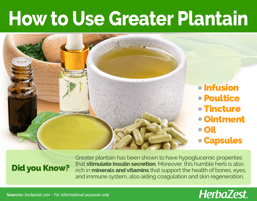 Tincture. This concentrated solution is another popular form of reaping the benefits of greater plantain by diluting a few drops into a glass of water for drinking, or pour a few drops onto a cotton pad for topical use to soothe the skin.