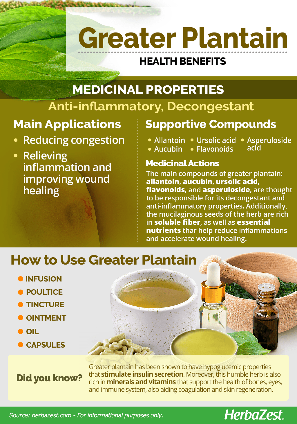 Relieving inflammation and improving wound healing. Greater plantain leaves can be applied to wounds, rashes, bites, and stings to soothe the affected area and accelerate cauterization.