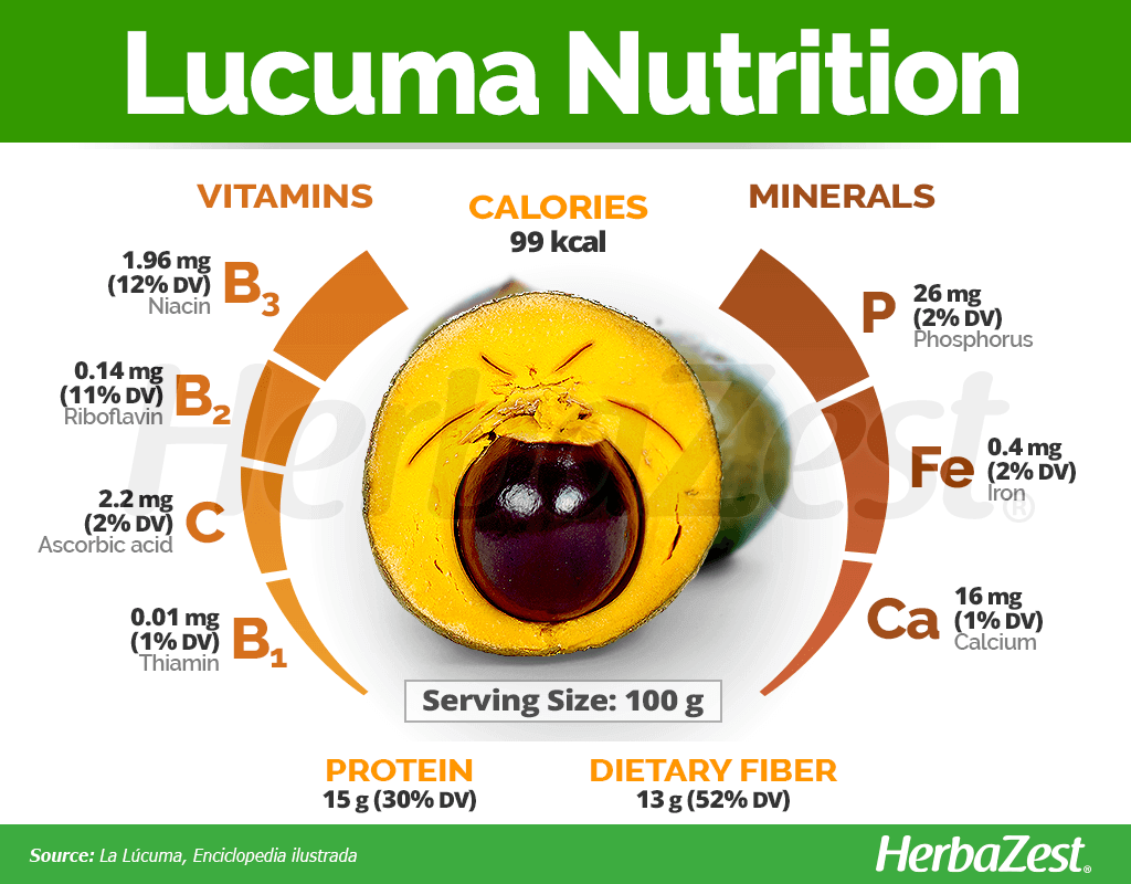 100 grams of fresh lucuma pulp provide 99 calories, as well as 30% and 52% of the daily value for protein and dietary fiber, respectively.