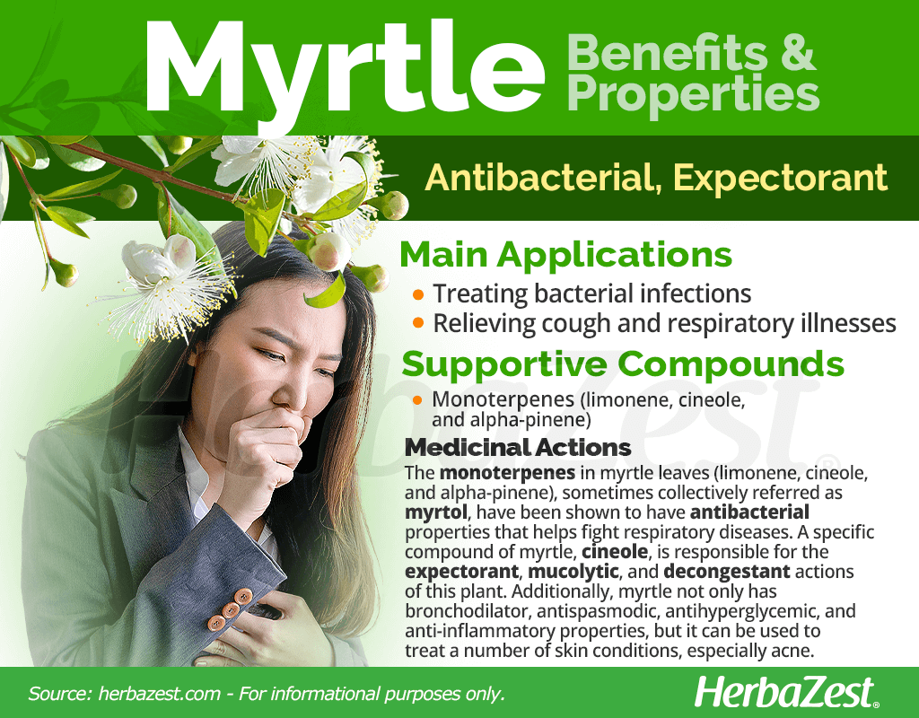 Relieving cough and respiratory illnesses. Myrtle has traditionally been used to treat respiratory problems due to its ability to open up airways and aid in the expulsion of phlegm.