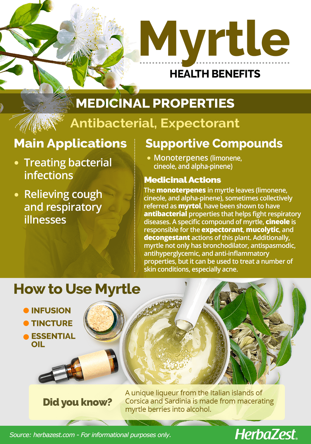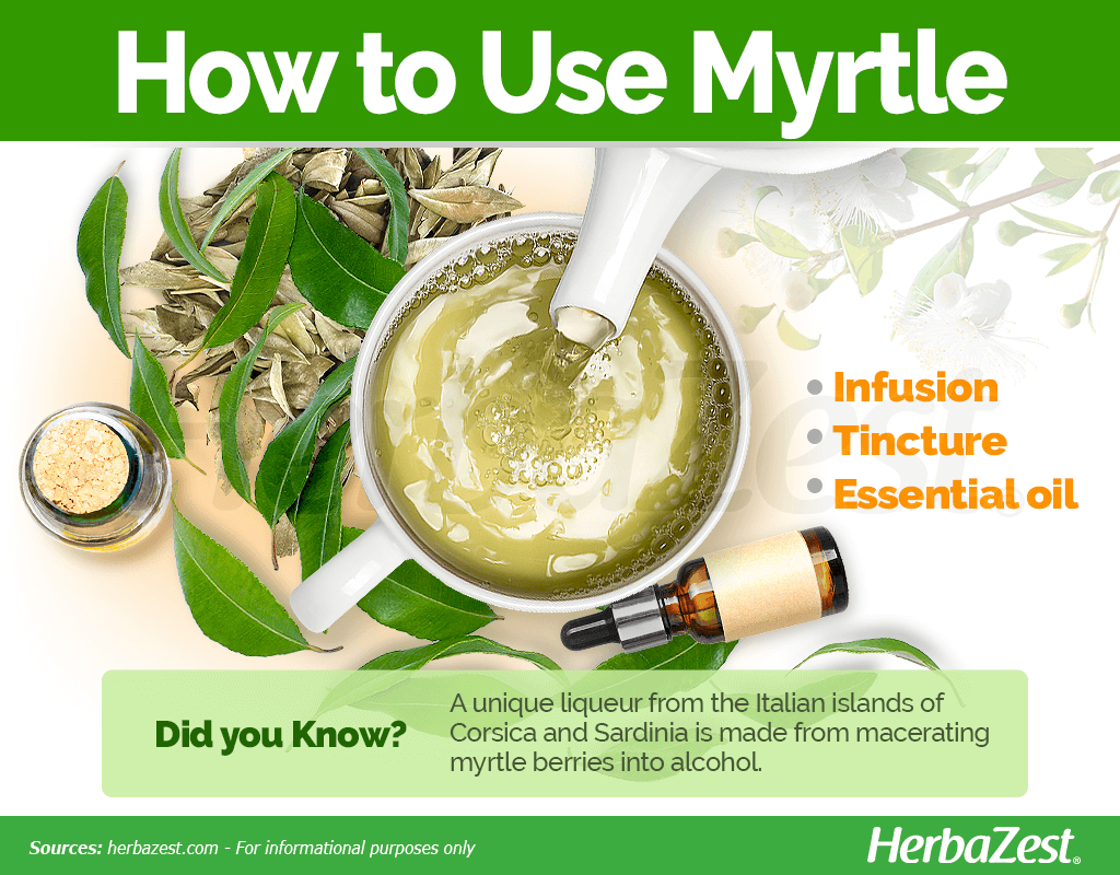 - Tincture. When prepared as a tincture, myrtle's antibacterial properties make it useful for alleviating bacterial infections, such as bronchitis.