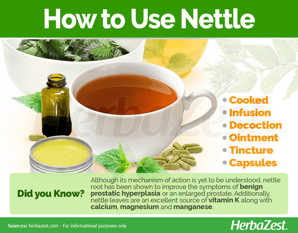 Infusion. Made from fresh or dried leaves, nettle tea can be consumed daily to relieve allergies and reduce joint inflammation.