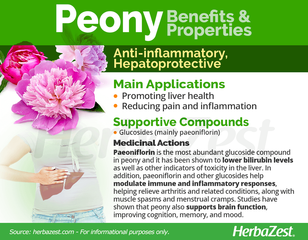 Reducing pain and inflammation. Peony's anti-inflamatory, immunostimulant properties have proven effective for treating rheumatoid arthritis and other related conditions, as well as for relieving muscle spasms and menstrual cramps.