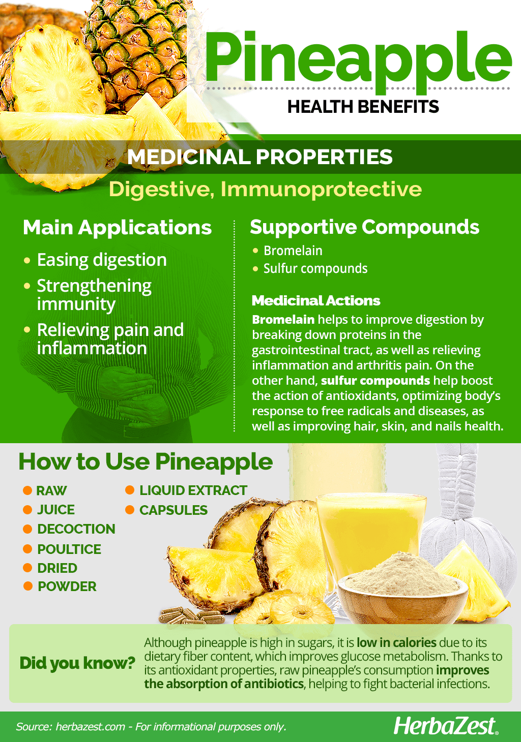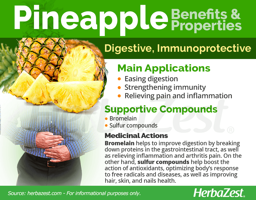 Pineapple is a well-known source of essential nutrients; however, the medicinal properties of pineapple have been traditionally used for centuries, and modern research has corroborated many of pineapple health benefits, mainly: