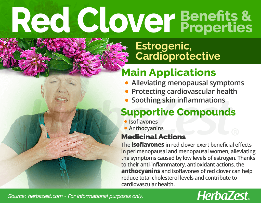 Protecting cardiovascular health. Red clover is rich in flavonoids, which not only keep cholesterol levels in check, but also reduce the risk of heart disease.