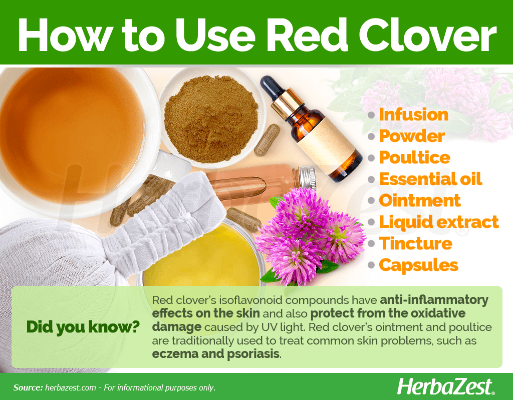 - Ointments. Topical applications of red clover ointment, infusions, or liquid extract can be applied as needed as long as they do not aggravate the skin or touch open wounds.