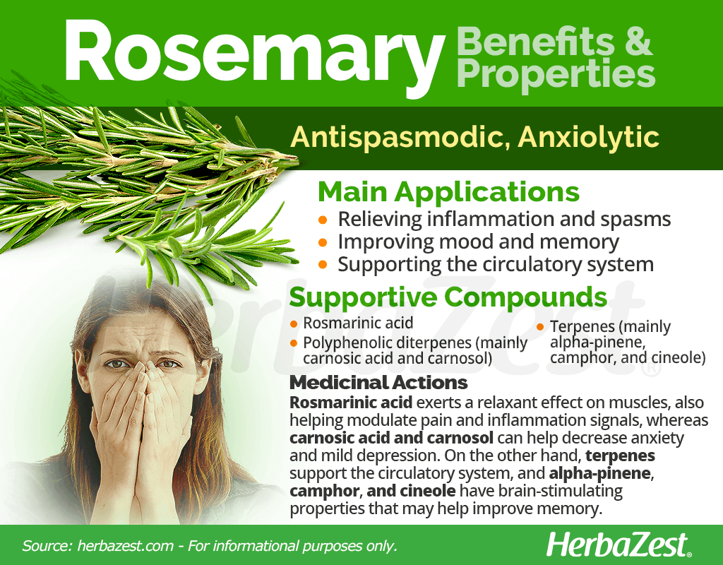 Improving mood and memory. Studies have shown that rosemary's properties promote overall mental health, reducing stress, anxiety, and mild depression. Rosemary compounds have also been shown to improve brain functions, including memory.