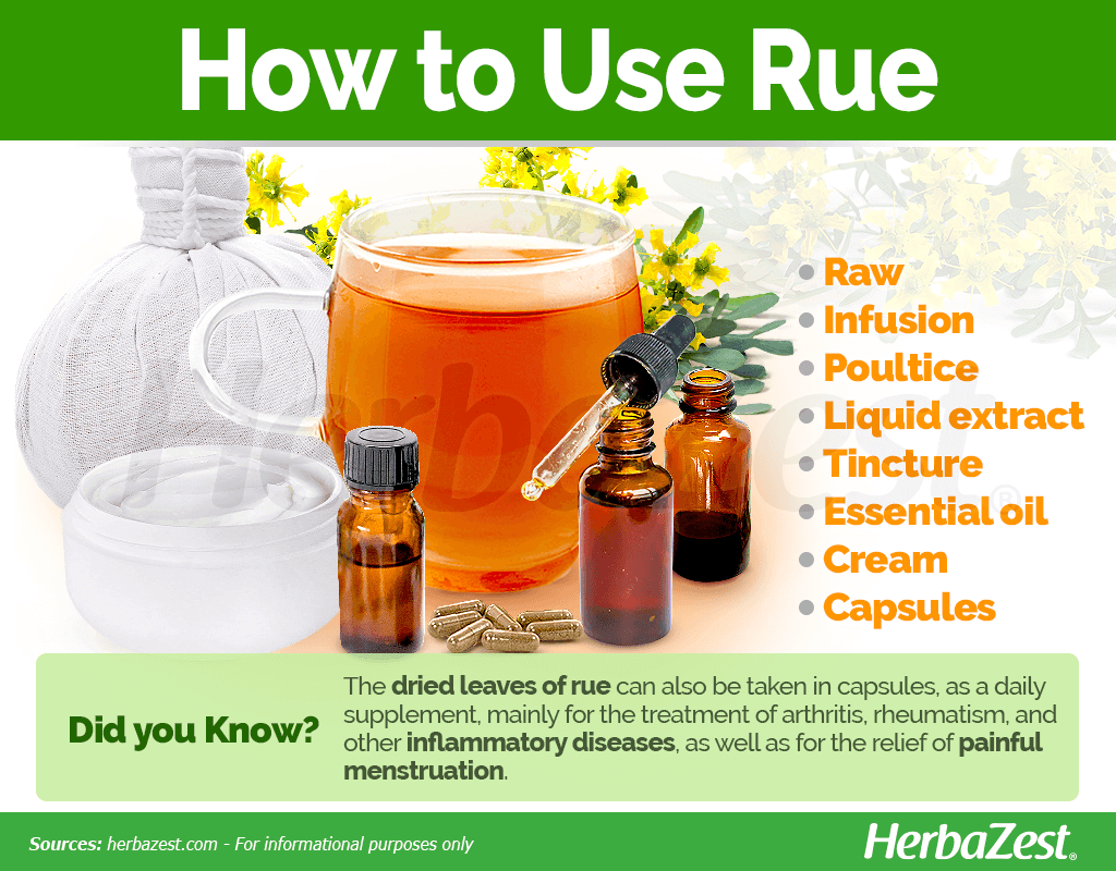Infusion. Both fresh and dried, the leaves of rue can be steeped in hot water and taken to relieve digestive complaints and painful menstruation.