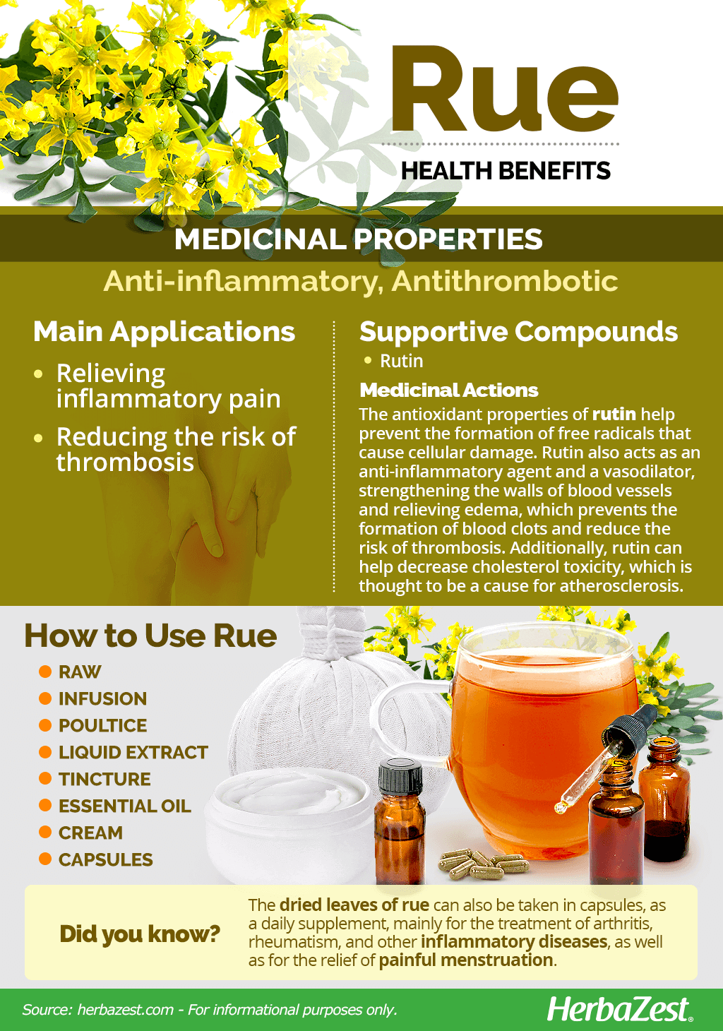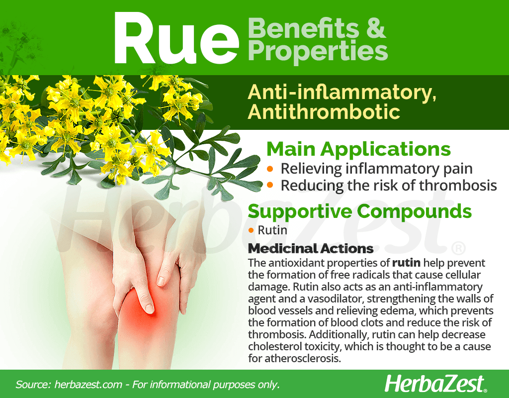 Relieving inflammatory pain. Rue properties has been used for centuries to treat menstrual pain, rheumatism, arthritis and other inflammatory conditions.