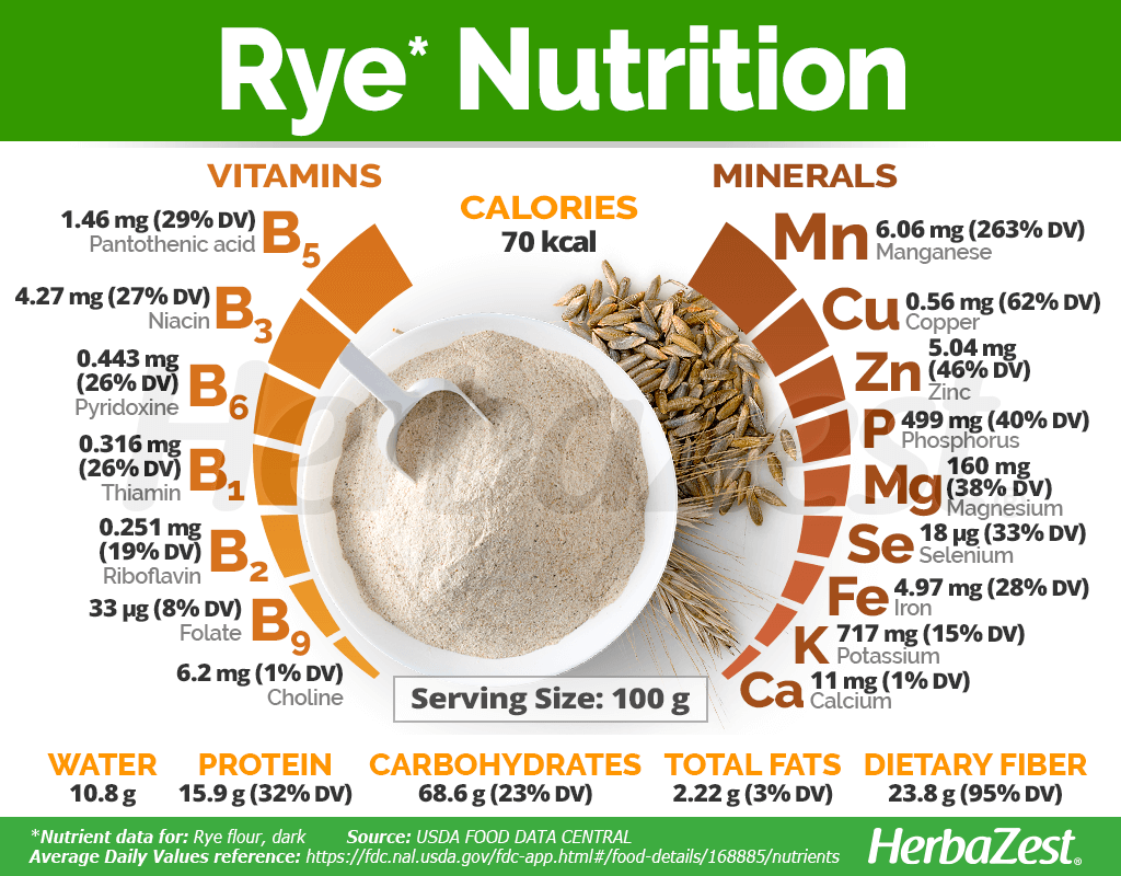 100 grams of rye flour provide 325 calories, 32%DV of protein, 23%DV of carbohydrates, and 95%DV of dietary fiber.