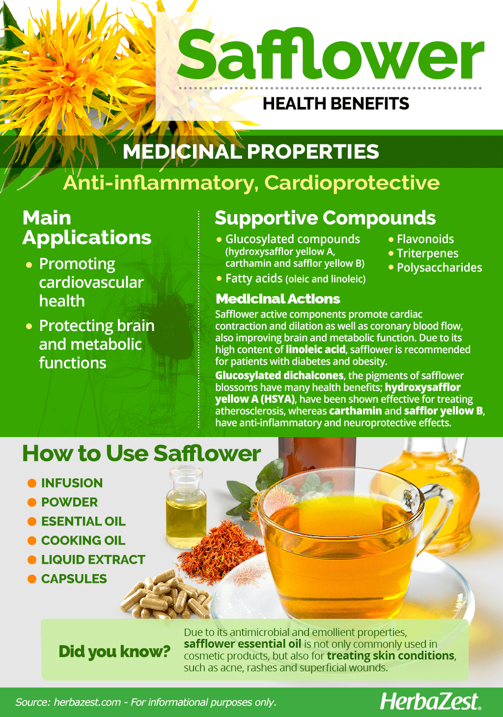 Infusion. Fresh or dried safflower blossoms are infused in hot water to extract their healing compounds. Drinking safflower tea is thought to help with fever, jaundice, pain, and anxiety, whereas its topical application may aid in treating skin conditions and superficial wounds.