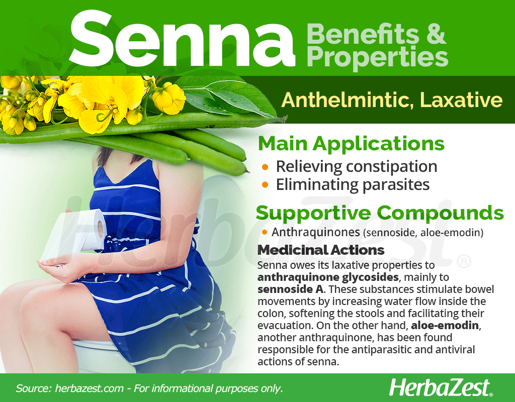 Senna works as a laxative because of a specific type of anthraquinone glycoside called sennoside A. Other anthraquinones present in senna are aloe emodin, and chrysophanols - and they all have laxative properties. These compounds stimulate bowel movements by increasing water flow inside the colon, softening the stools and facilitating their evacuation.1,2