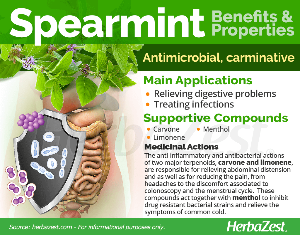 Treating infections. Spearmint has proven effective for inhibiting a variety of bacterial strains affecting gut's health as well as treating the common cold, cough, and oral infections.