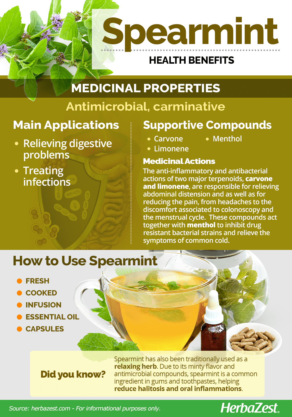 Infusion. This is the most popular way of getting the carminative and antimicrobial properties of spearmint. A warm spearmint tea, made from fresh or dried leaves, can help with indigestion, flatulence, gastritis, and common cold symptoms.