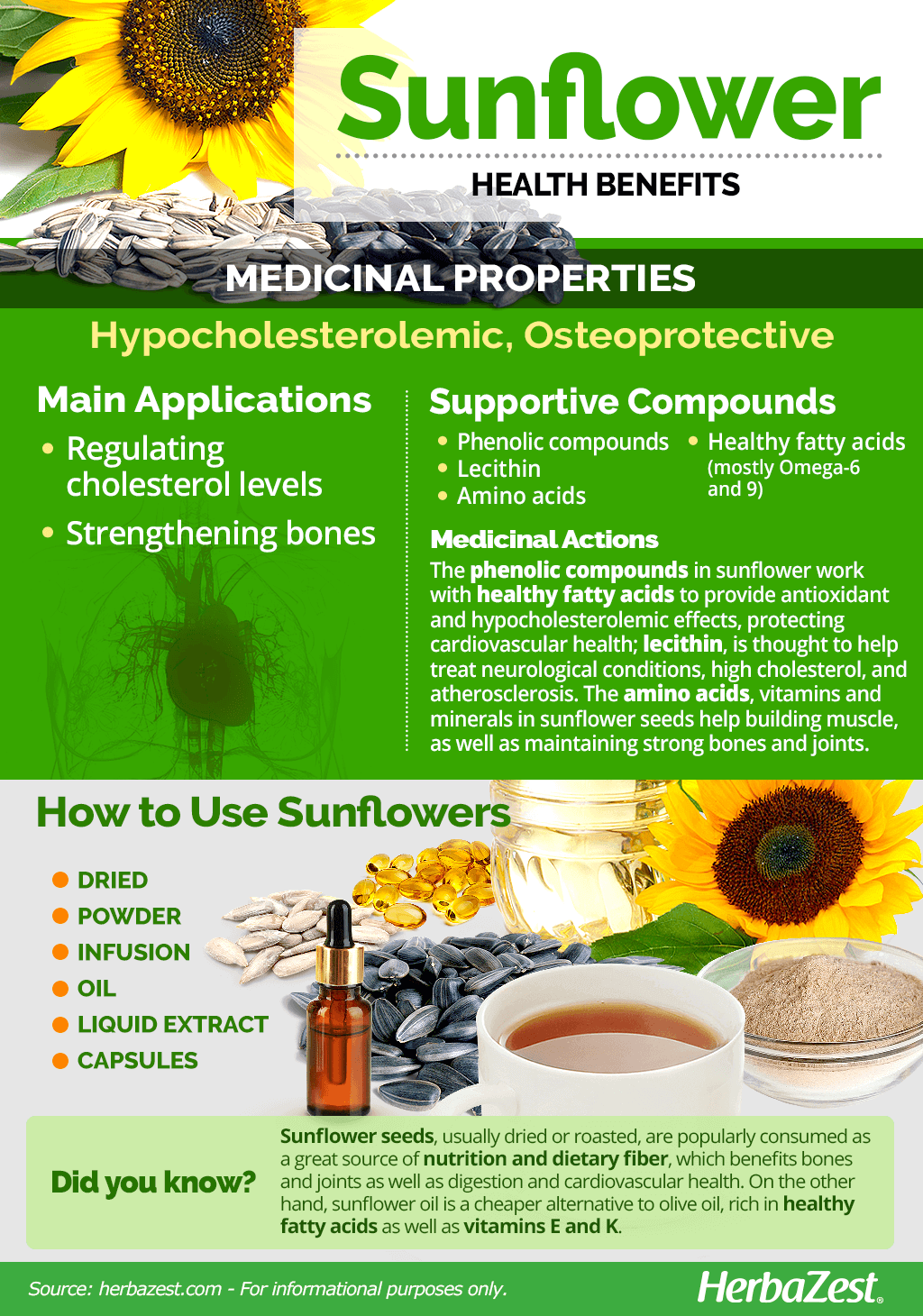 Sunflower's properties have been known since ancient times, and the whole plant, leaves, seeds and oil have been used for treating a variety of health conditions. Modern science has validated many sunflower benefits, mainly for: