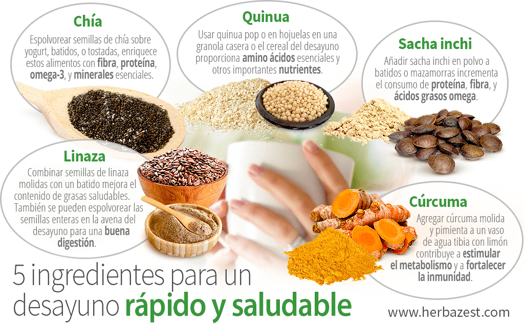 La quinua es una semilla muy versátil, reconocida por ser una rica fuente de nutrientes, que incluye proteínas completas, grasas saludables, carbohidratos complejos y minerales. La quinua cocida de la noche anterior se puede calentar con manzana picada, canela y miel. Para un desayuno instantáneo saludable, las hojuelas de quinua pueden convertirse en una papilla o se puede comer quinua pop en reemplazo del clásico cereal del desayuno, espolvoreándola sobre yogurt y frutas, o agregándola a un tazón de muesli.