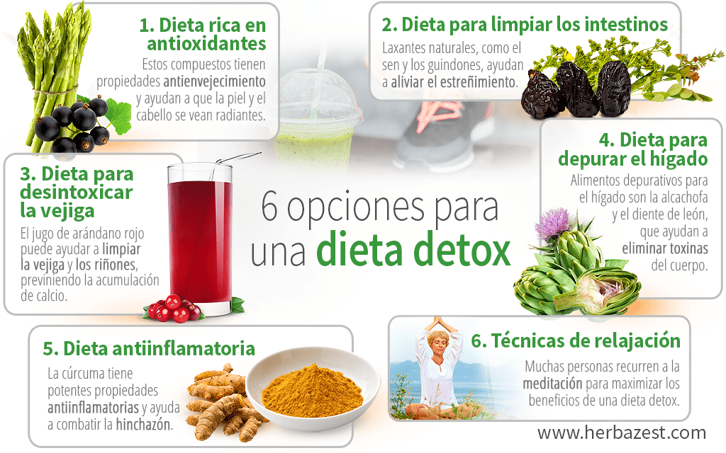 Las siguientes son 6 opciones para una dieta detox, cada una de las cuales debe ser considerada de acuerdo a los objetivos que se desean alcanzar: