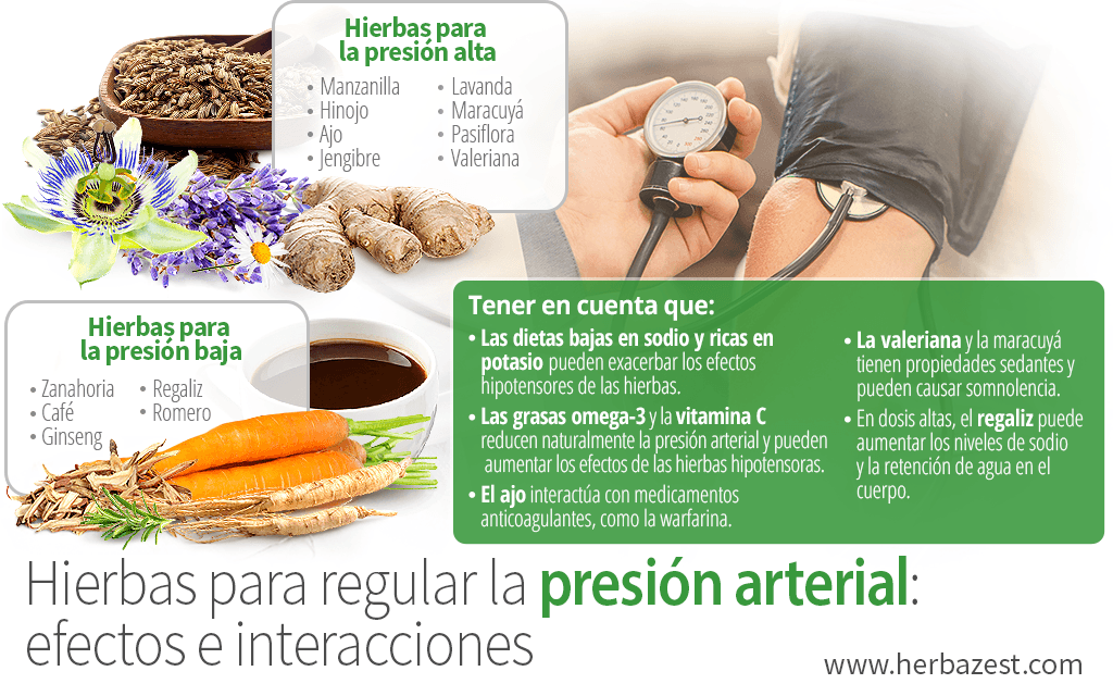 Se ha demostrado que el ajo, el jengibre, la maracuyá y la valeriana son efectivos para controlar la presión arterial alta. El ajo reduce los niveles de triglicéridos y colesterol para ayudar en la prevención de cambios cardiovasculares adversos relacionados con la edad; sin embargo, se sabe que interactúa con anticoagulantes como la warfarina. La raíz de jengibre tiene propiedades antiespasmódicas, que ayudan a mejorar la circulación sanguínea al relajar los músculos que rodean las arterias. El uso de ajo y el jengibre en recetas de comidas saludables de inspiración asiática es una excelente manera de obtener sus beneficios hipotensores. Los estudios han demostrado que otras populares hierbas para la presión alta, como la manzanilla, la lavanda y el hinojo, son realmente efectivas.3