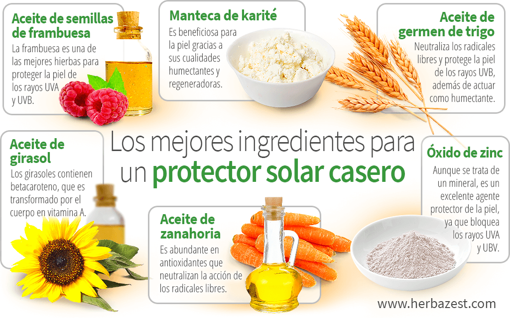 El compuesto mineral óxido de zinc (disponible en polvo), aplicado de forma externa, protege la piel de los rayos UV y UVB. Las hierbas mencionadas anteriormente, con la excepción del aceite de frambuesa, no resguardan la piel de los rayos UV, que se infiltran profundamente. Por ello, los mejores ingredientes naturales para un protector solar casero son los aceites de zanahoria, girasol, karité o germen de trigo, combinados con óxido de zinc para garantizar una protección completa contra la radiación.