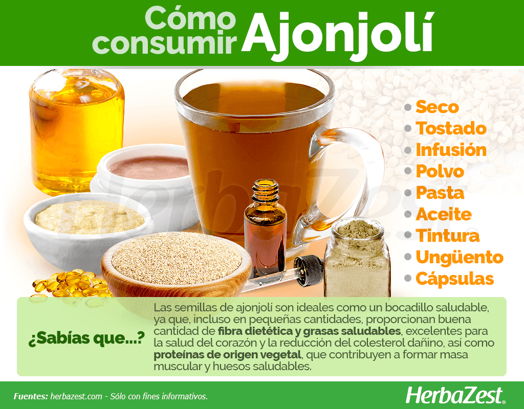 Tintura. Esta preparación se puede hacer en casa, cubriendo las semillas trituradas con alcohol para extraer las propiedades del ajonjolí. Se debe diluir con agua antes de consumir, como complemento para fortalecer la salud cardiovascular.