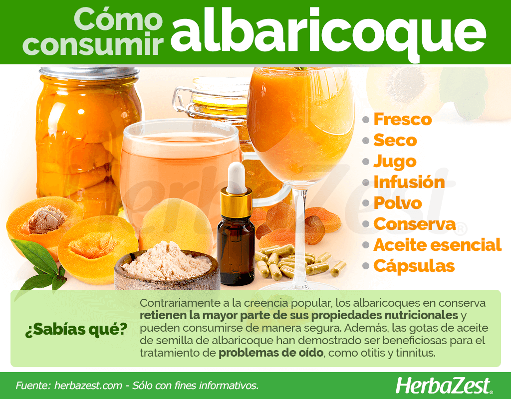 La forma más eficaz de obtener los beneficios del albaricoque, o damasco, es comer la fruta en su estado natural, debido a su alto contenido en vitaminas y minerales. Sin embargo, existen muchas de formas (culinarias y medicinales) en las que los albaricoques pueden prepararse y utilizarse.