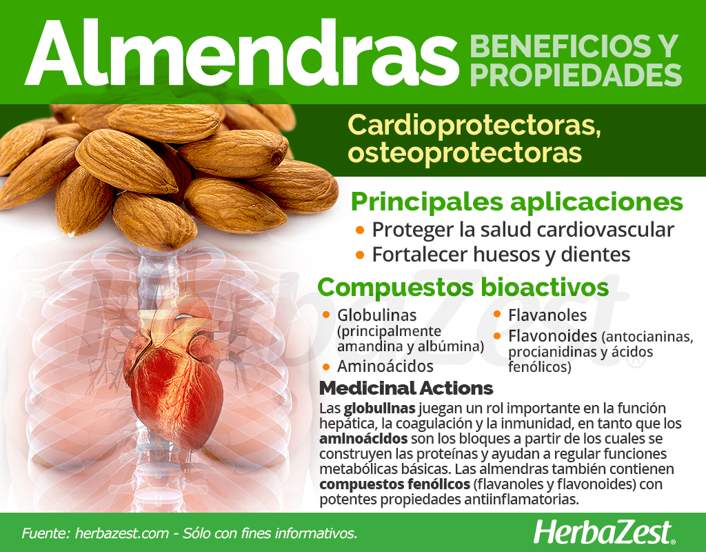 Proteger la salud cardiovascular. Se ha demostrado que las almendras ayudan a regular los niveles de colesterol, así como la presión arterial, reduciendo así el riesgo de enfermedades del corazón.1