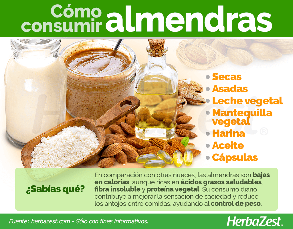 23 almendras enteras sin tostar (una onza o 28,35 g) suman 164 calorías,con un 12 % y un 14 % del valor diario de proteína y fibra dietética, respectivamente.