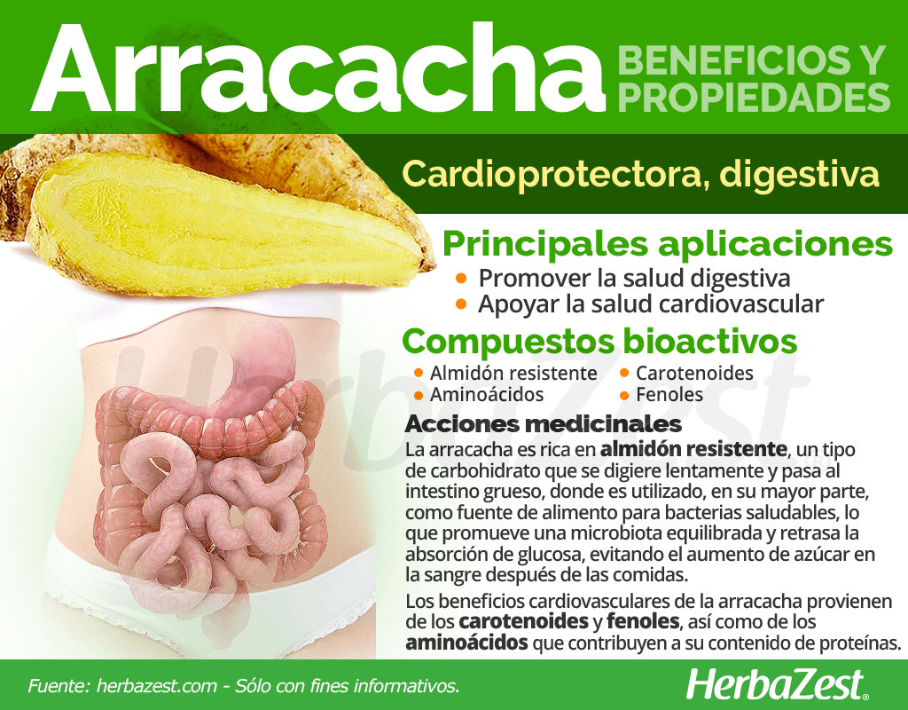 Promover la salud digestiva. La raíz de arracacha es rica en almidón resistente, que promueve una digestión suave y una flora intestinal saludable, lo que incluye aliviar el estreñimiento y la diarrea.